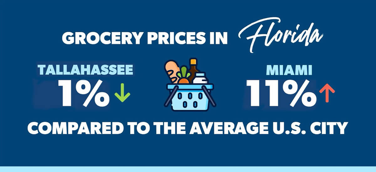Grab your grocery cart—we’re headed to Publix! This popular Southeastern supermarket chain was founded and is headquartered in Florida, so there’s a good chance you’ll buy some oranges and key lime pies there if you move to the sunny state. Groceries in Florida range from just below the national average in Tallahassee to 11% higher in Miami.