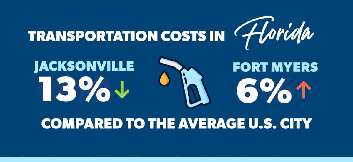 Rev up your engines! Florida transportation costs range from 13% lower than the national average in Jacksonville to 6% higher in Fort Myers.