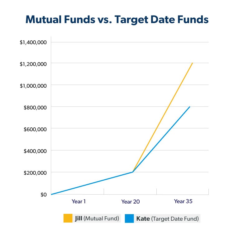 Both investors come out of the gate with a similar strong start. But over time, Kate’s target date fund begins falling behind. By the time they retire 35 years later, Jill’s nest egg has averaged an 11% rate of return and grown to roughly $1.2 million. Because Kate’s target date fund became more conservative the closer she got to retirement, her rate of return dropped to 8% in the last 15 years.