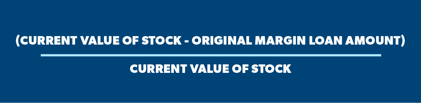 Let’s use Jerry as an example again. Remember, he bought stock for $10,000 and purchased half of that stock with borrowed money. So that means Jerry had 50% equity at the start of his margin trade. You can calculate the amount of equity in your account by using the following equation: