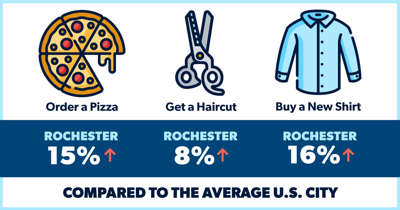 Rochester returns to represent most New York State cities for miscellaneous costs, which is 6% higher than the national average. In Rochester, you can order a pizza for $12, get a haircut for $19, and buy a shirt for $37. For reference, those prices are $10, $18 and $32 for the average U.S. city.17 But if you want the original Garbage Plate for dinner, you’ll have to go to Rochester to get Nick Tahou’s.