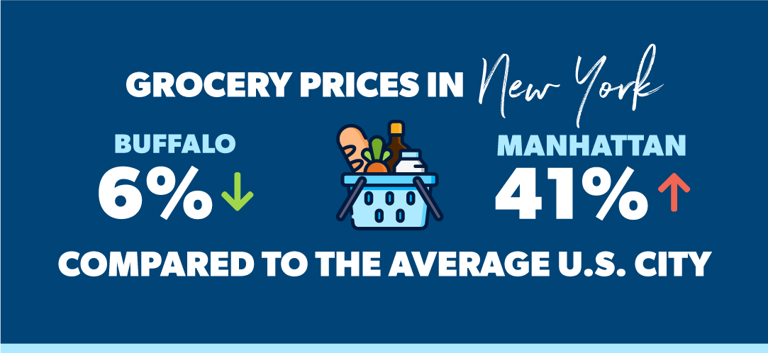 Have you ever met shoppers proud enough to brag about their grocery store? Well, if you move to New York, you might start bragging about Wegmans—named America’s favorite grocery store for several years in a row.8 Speaking of groceries, New York State groceries range from 6% lower than the national average in Buffalo, to 41% higher in Manhattan.9