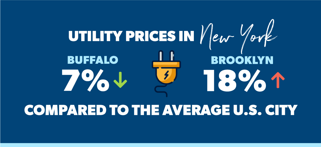Utility costs like energy and phone use in New York State range from 7% lower than the national average in the western city of Buffalo (birthplace of Buffalo wings!), to 18% higher in Brooklyn.6