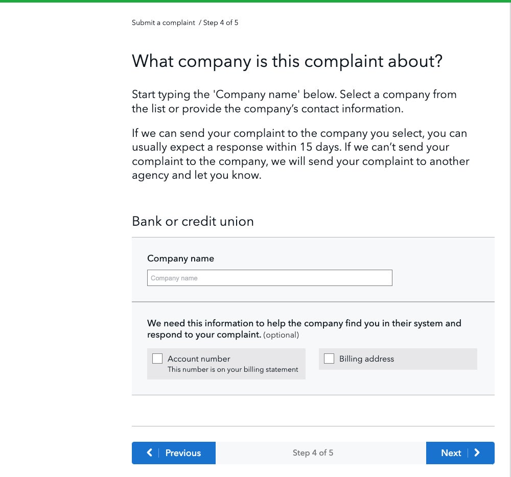 If you’re complaining about a bank, you’ll have the option to include specific information about your account, including your billing address and account number.