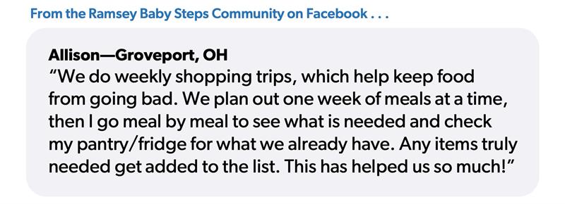 This is exactly what Allison from the Ramsey Baby Steps Community Facebook group does: “We do weekly shopping trips, which help keep food from going bad. We plan out one week of meals at a time, then I go meal by meal to see what is needed and check my pantry/fridge for what we already have. Any items truly needed get added to the list. This has helped us so much!”